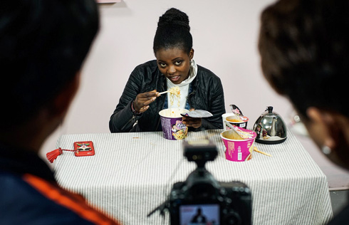 A Beijing Chenjinglun High School student studies while she has breakfast in preparation for the national college entrance exam known as the gaokao, May 15, 2017. [Photo/VCG] |