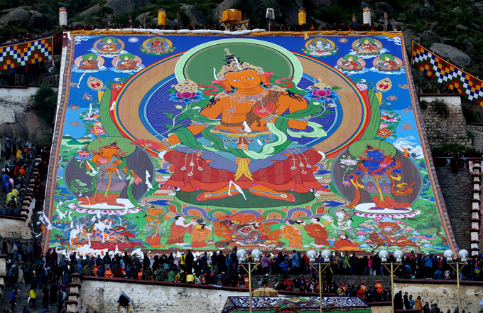 Thangka adorns hillside during Shoton