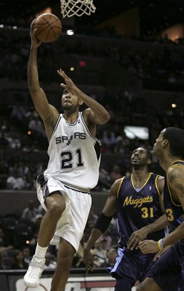 The Nuggets trailed 74-60 after three quarters. They were down 82-65, but a 16-5 run capped by Iverson's 3-pointer brought Denver within 87-81 with 3:23 left. It was the closest they had been since 7:11 was left in the first half. Nene's dunk with 1:12 left made it 89-85. Ginobili scored for the Spurs, but Iverson's second 3 of the quarter made it 91-88. Duncan's layup with 27 seconds to go put the Spurs up 93-88. Finley hit two free throws after being fouled by Iverson with 16.5 seconds left and Parker added two more with 9.9 seconds left. The Spurs took the lead for good at 11-10 on a layup by Duncan with 5:42 left in the first quarter. They led 49-41 at halftime. Camby was aggressive off the boards, getting 11 rebounds in the first half. Nene had one rebound at the half and two at the end of three quarters. He finished with seven. Fabricio Oberto grabbed 10 boards for the Spurs. Iverson and Anthony combined for 61 points in Game 1. With just over two minutes to play in the third quarter, Robert Horry blocked Iverson's shot on the break and Ginobili converted for just his second field goal of the game to give San Antonio a 67-55 lead. On the next possession, Bruce Bowen, who had hit three 3-pointers, stole the ball from Steve Blake and passed to Ginobili, who sank a 3 to put the Spurs up by 15. It was Anthony's 11 points in the third quarter that kept the Nuggets within 14 heading into the final period. |