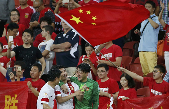 South Korea's Lee Jeong-hyeop (R) celebrates after scoring a goal as Australia's Trent Sainsbury reacts during their Asian Cup Group A soccer match at the Brisbane Stadium in Brisbane January 17, 2015. [Photo/Agencies] |
